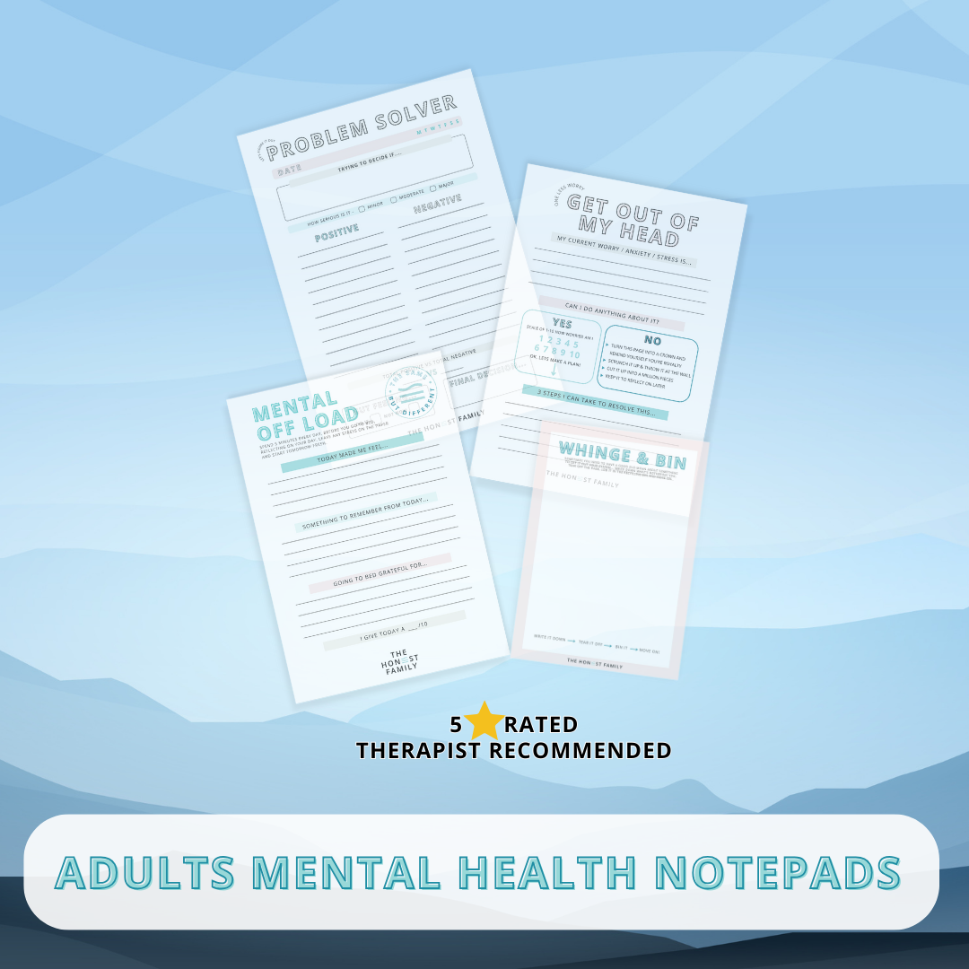 Mental Health Notepad Bundle - 5 Star Rated - 4 Notepads - A5 Mental Offload - A5 Get out my Head - A5 Problem Solver - Luxury pen with stylus- - A6 Whinge and Bin - The Honest Family